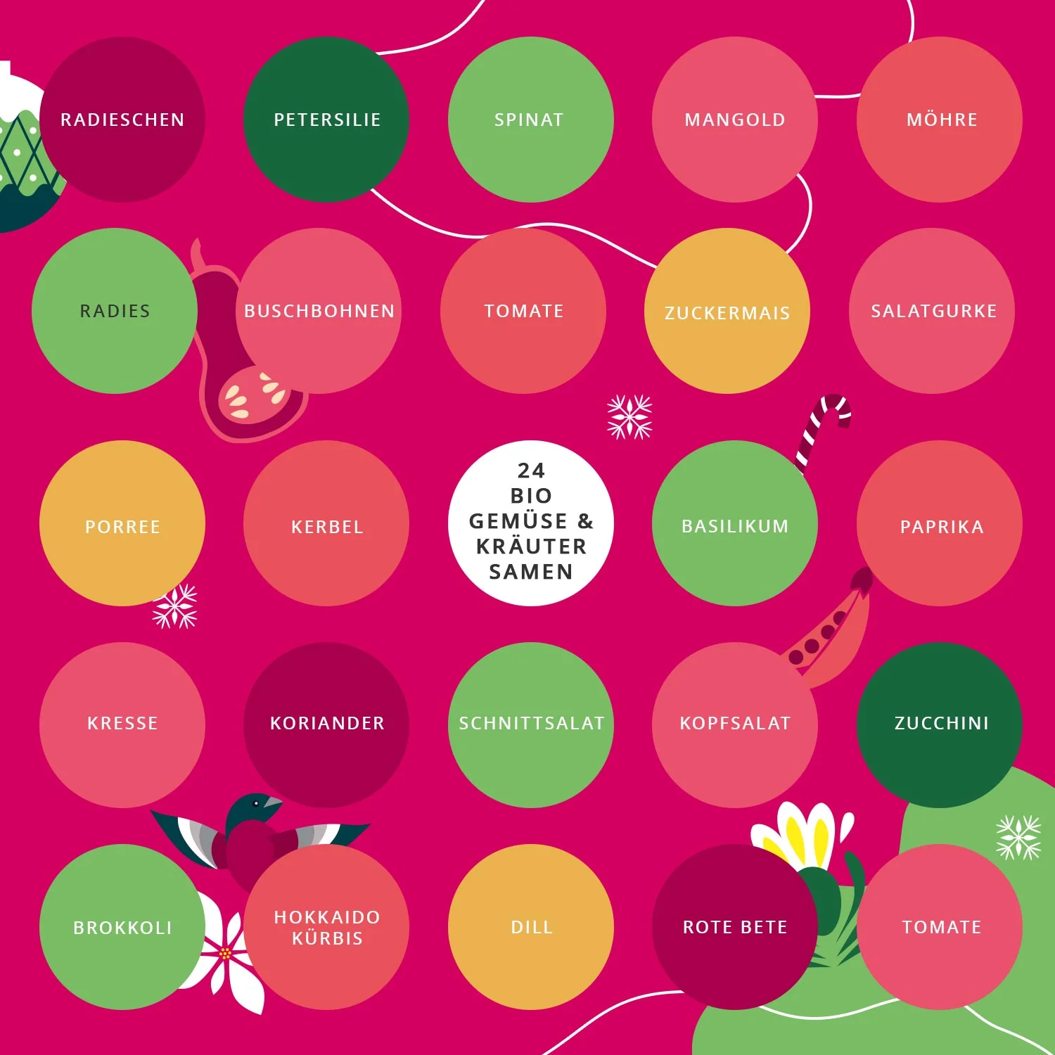 Der Kalender enthält alle unsere Lieblingskräuter und -gemüsesorten. Günstig für 24 verschiedene Anbausamen und sehr stabil gemacht.