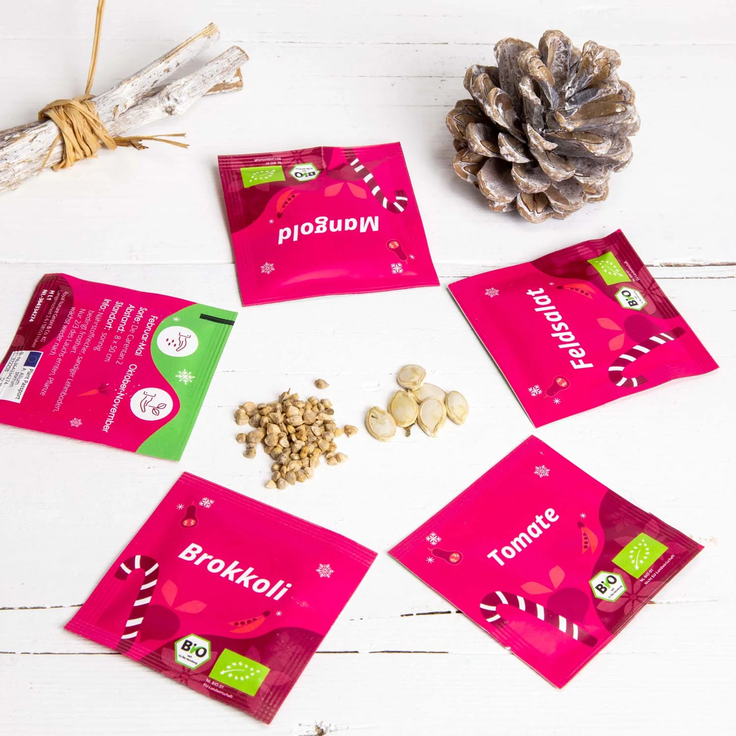 Der Adventskalender enthält 24 verschiedene Bio-Saatgutarten für Gemüse sowie Kräuter, die auch in kleinen Gärten gezogen werden können und bietet eine Vielfalt für Beete, Hochbeete, Balkon oder Terrasse. Überdies ist das Saatgut frei von Gentechnik, besitzt eine hohe Keimfähigkeit und ist samenfest.