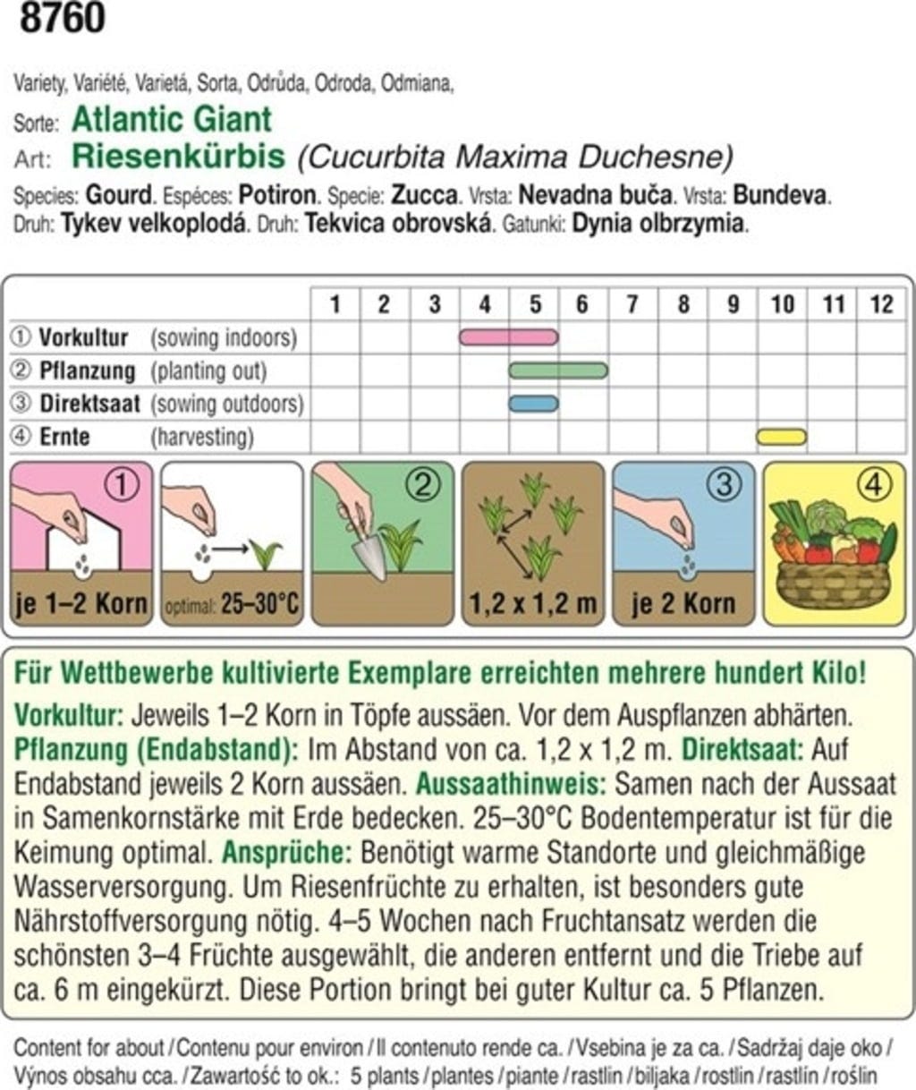 If grown under optimal conditions and perfect nutrient supply, the "Atlantic Giant" pumpkin can grow up to 600 kg pumpkins! It is ideal as a cooked or fried side dish or in soups. It should only be eaten when fully ripe.