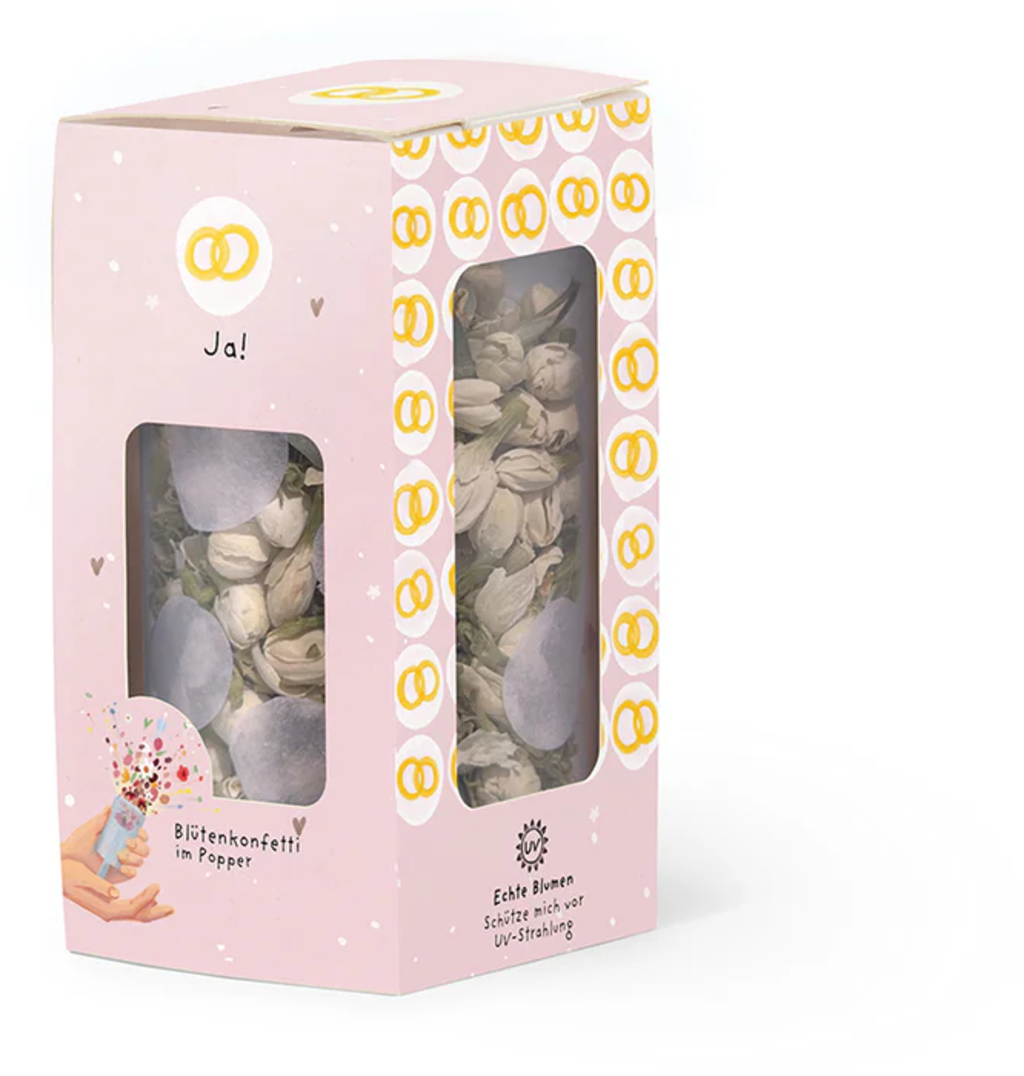Feiert die Liebe mit nachhaltigem Blütenkonfetti! Ob als Hochzeitsgast oder Brautpaar – dieser Popper mit der Aufschrift „Ja!“ bringt Freude, Farbe und ein bisschen Natur in den schönsten Moment des Lebens. Ideal für Hochzeiten, kirchliche Trauungen oder freie Zeremonien.