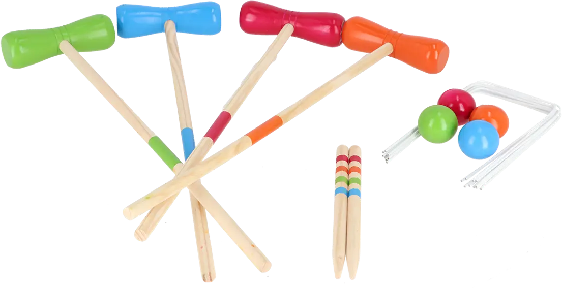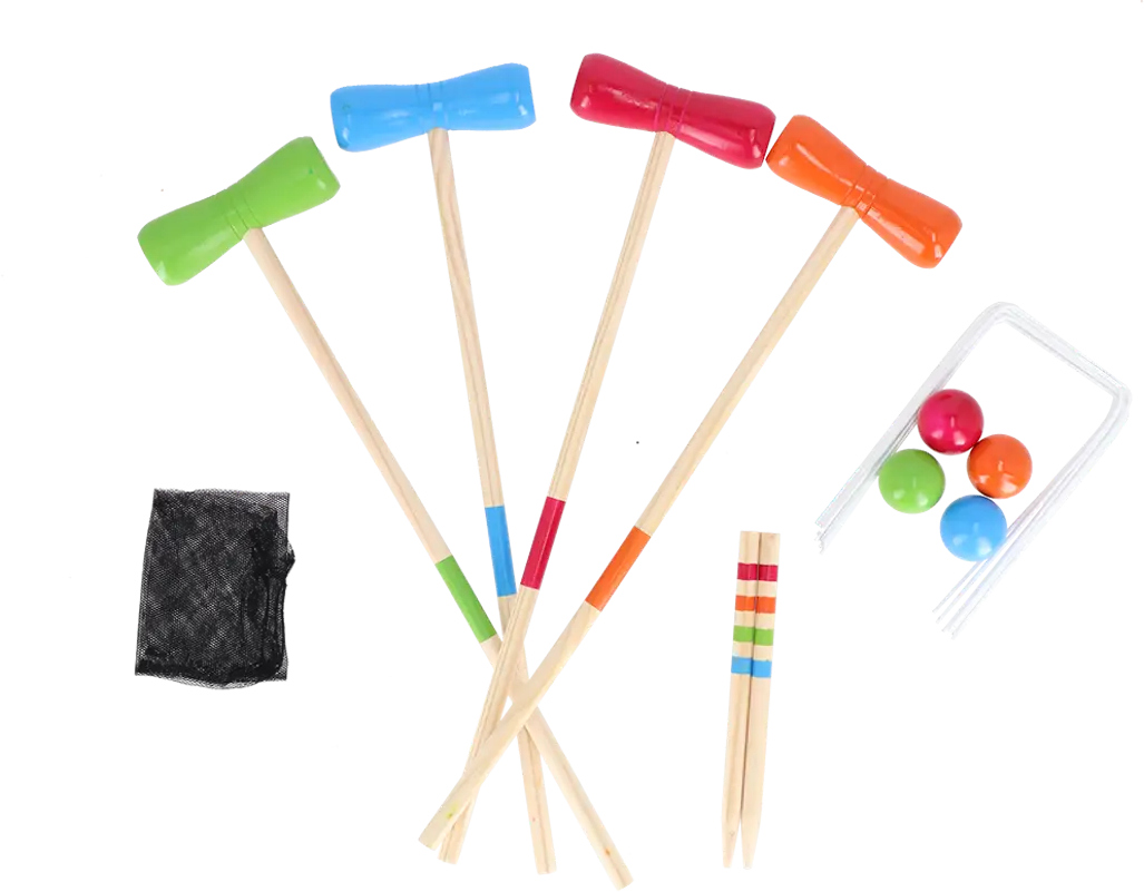 - Crocket set including 4 wooden mallets, 4 balls and metal goals