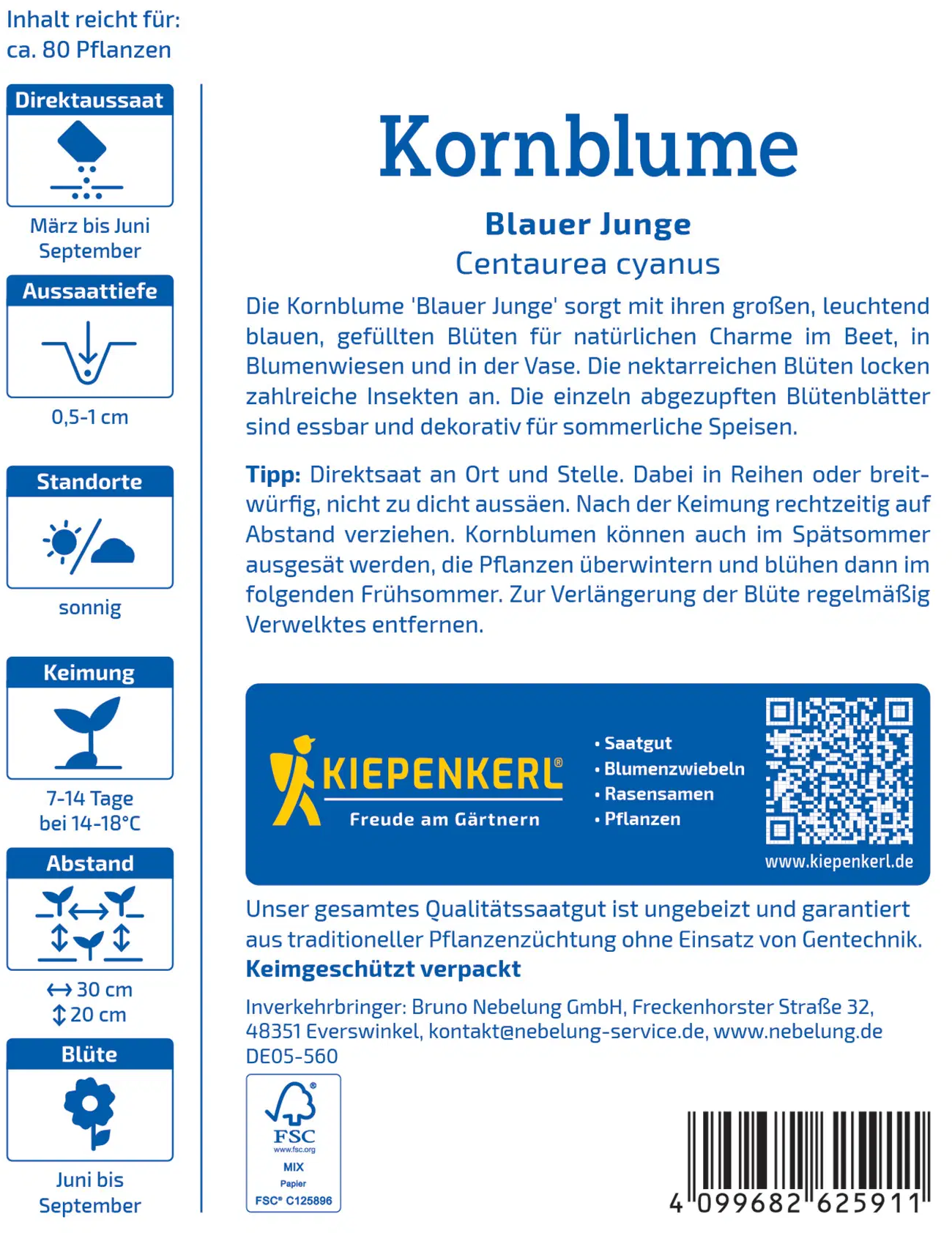 The 'Blue Boy' cornflower produces beautiful and large bright blue flowers that are impressive both in the garden bed and in a vase. The nectar-rich flowers attract bees and other pollinators, bringing vibrant colour to any garden. Whether as part of a flower meadow or as a colourful highlight in a bed, this annual adds a charming natural accent.