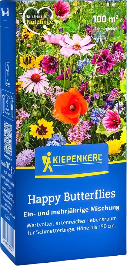 The Happy Butterflies mix transforms the garden into a colourful floral paradise for butterflies. Plants grow up to 150 cm tall and provide shelter and food for numerous insects throughout the summer. This creates a vibrant, natural habitat full of colour and movement.