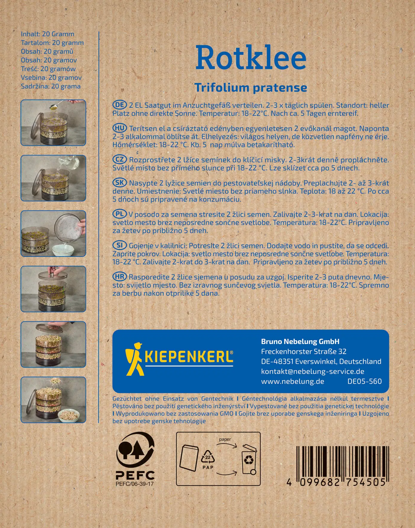 Red clover sprouts have with their mild, delicate, and slightly nutty flavour. Rinse 2–3 times daily; the sprouts are ready to eat after 3–5 days.