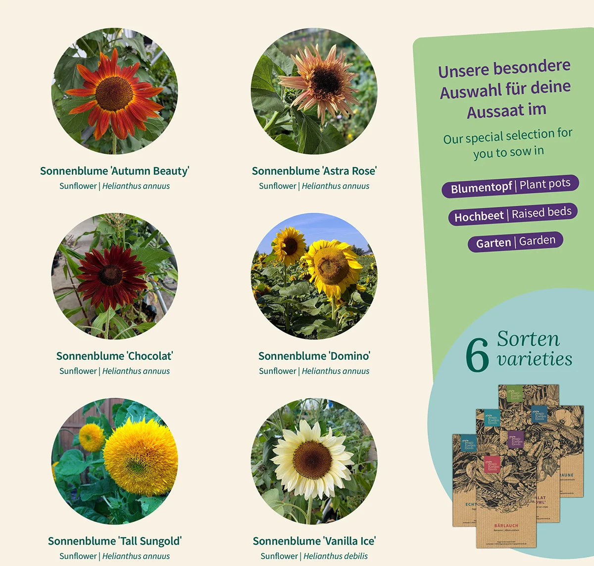 - Seed set contains 6 different sunflower varieties