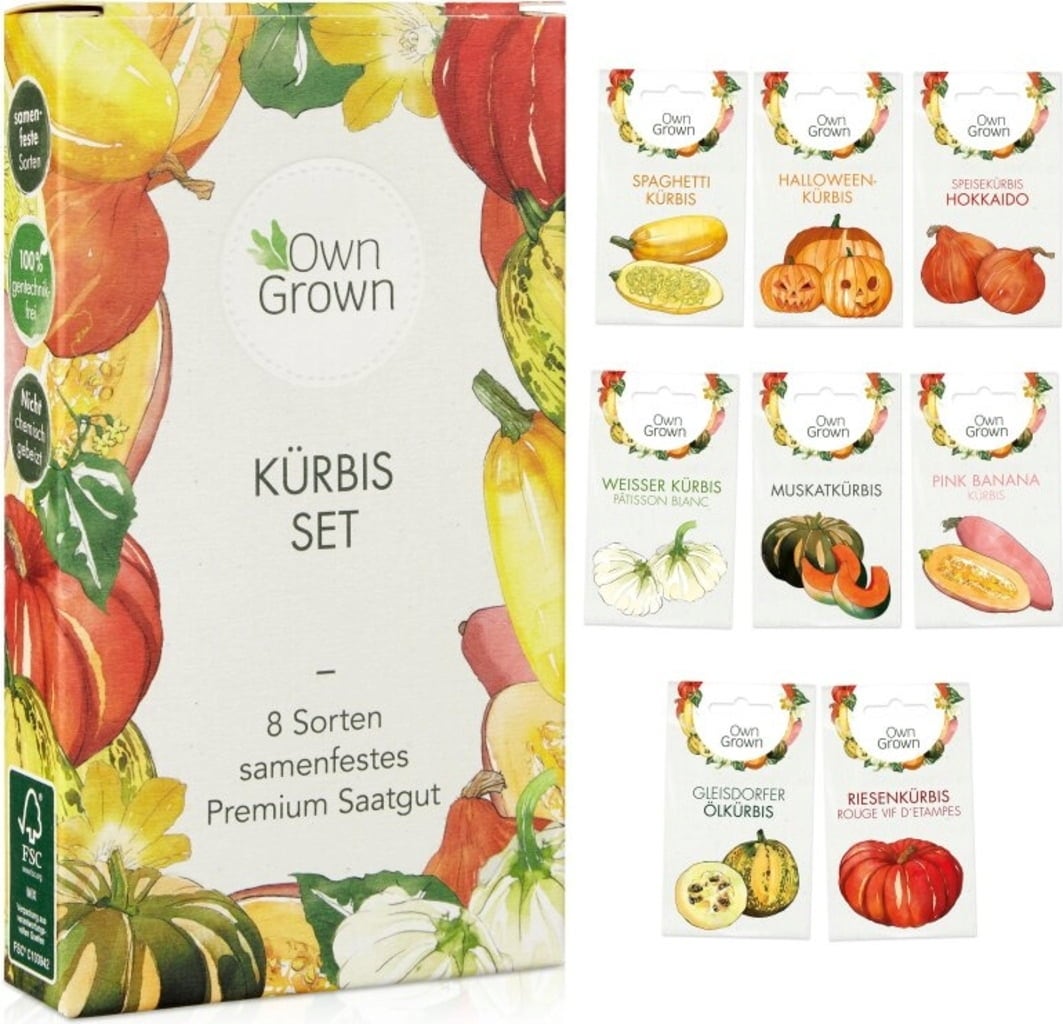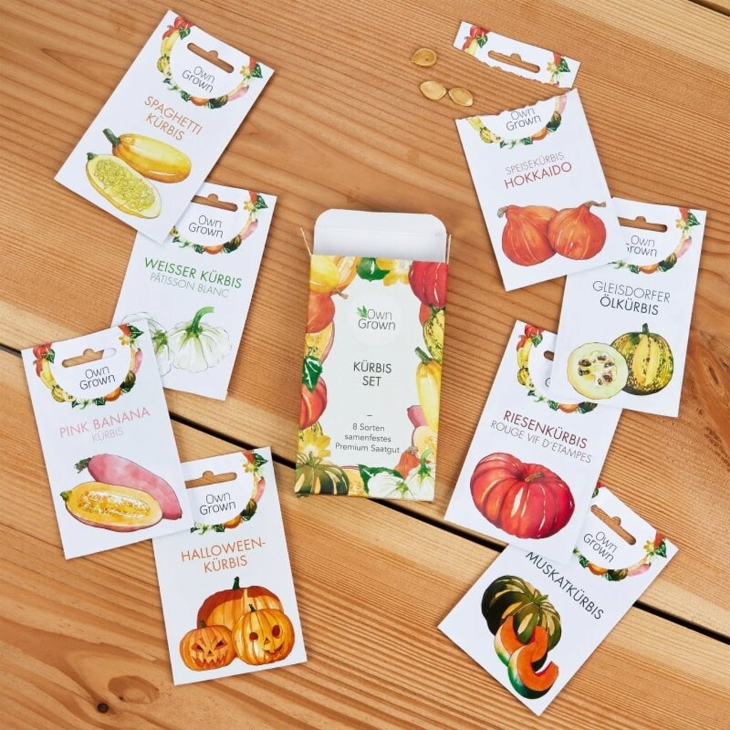 This set contains seeds of eight different pumpkin varieties, all of which are edible and decorative - perfect as seasonal autumn decor. Use them to make soup, roast them in the oven, add to bread or even desserts - it is hard ot find a vegetable as versatile as the pumpkin! On the back of each seed packet are instructions on sowing, care and harvesting. Depending on the variety, they can be grown in raised beds, greenhouses, gardens or on the compost heap.