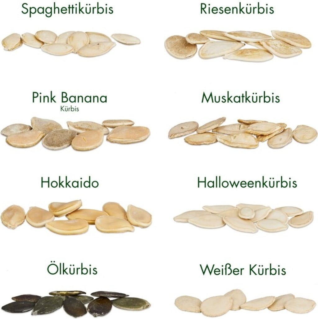Hokkaido (Uchiki Kuri), White pumpkin (Pâtisson blanc), Spaghetti pumpkin, Jack O' Lantern (Halloween pumpkin), Muscat pumpkin (Muscat de Provence), Giant pumpkin (Roter Zentner), Gleisdorfer oil seed pumpkin, Banana pumpkin (Pink Banana)