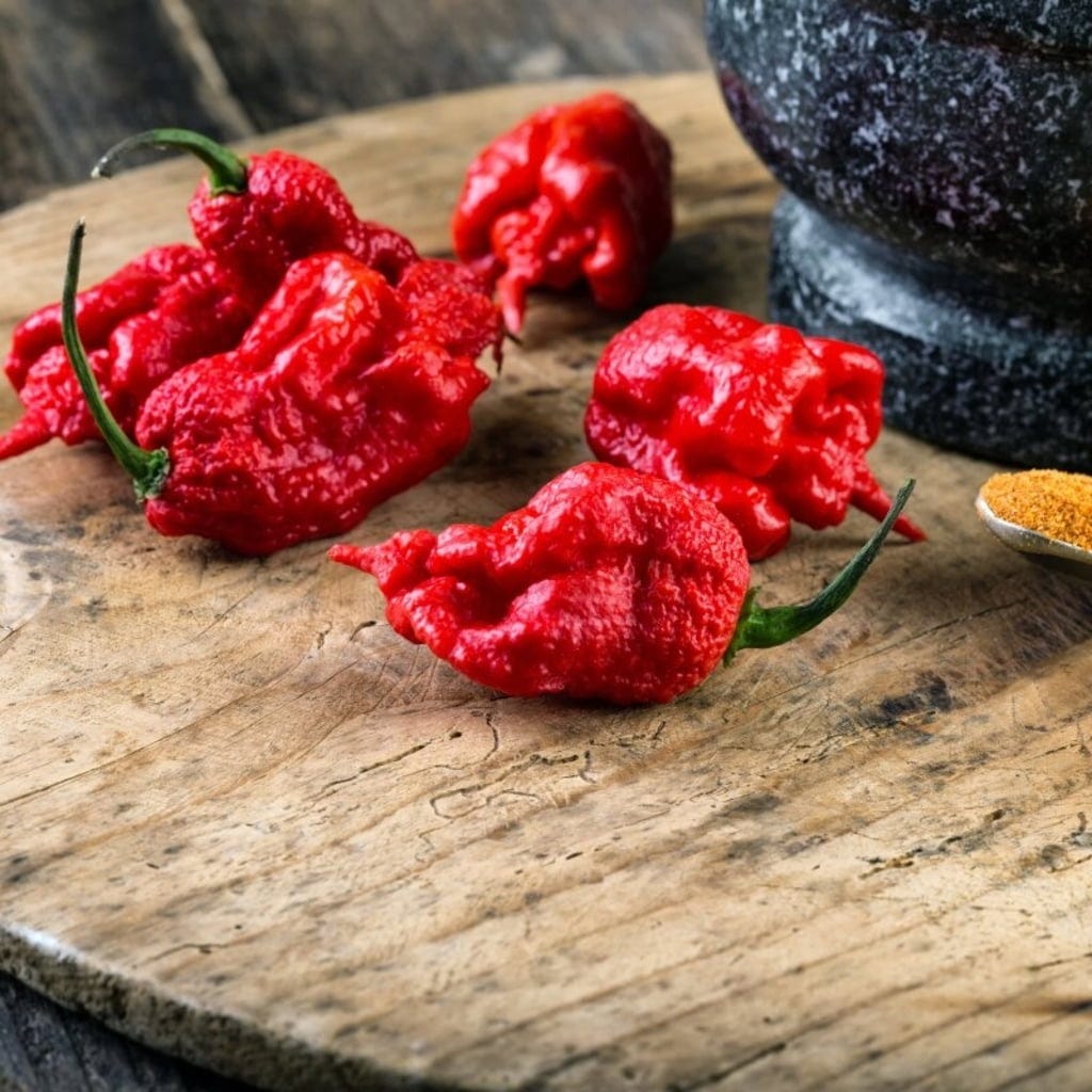 The Carolina Reaper is recognised as the spiciest chilli in the world. And as such, it should be handled and consumed with extreme caution. A chilli that is the reserve of the truly hardened chilli lover! But even if you're not a fan of extreme heat, cultivating this plant is a genuine delight and challenge for avid gardeners. Whether in raised beds or pots, the Carolina Reaper is a stunning addition to any garden, producing fiery red, uniquely wrinkled fruits that are a real conversation starter. Note: These chillies are not intended for fresh consumption - they are best enjoyed dried or processed into spice pastes.