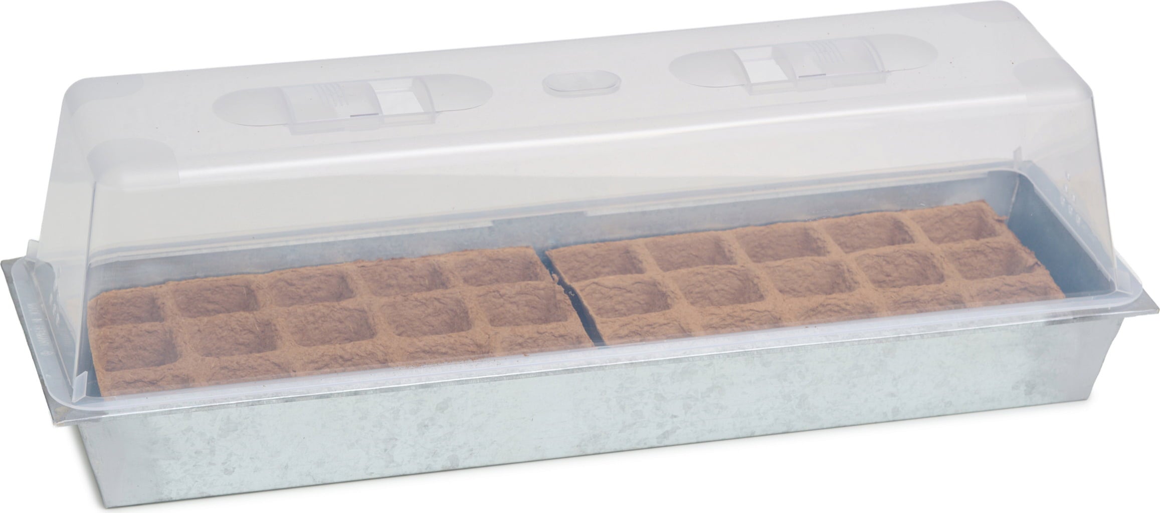 Growing plants from seeds is easy with Romberg's zinc greenhouse. The robust zinc tray and unbreakable cover create an optimum microclimate that can be adjusted as required with the practical ventilation controls. 30 biodegradable cellulose pots offer a sustainable way to sow seeds and grow your own plants - perfect for balconies, windowsills or small gardens. Available in the colours zinc grey or green.