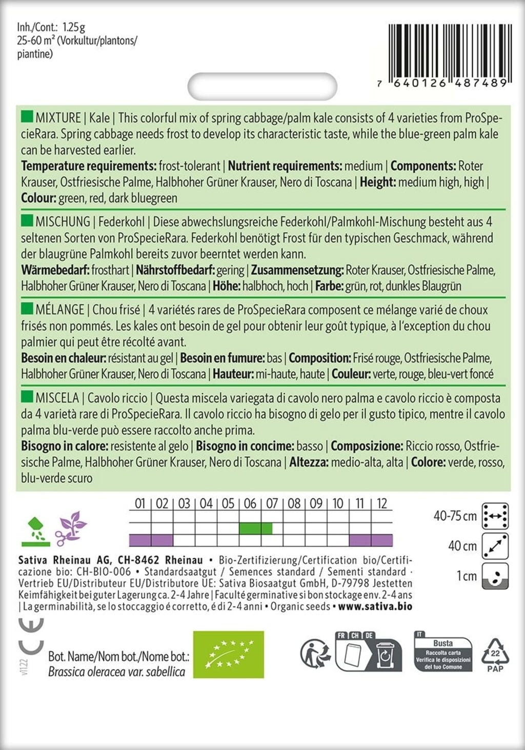 A mixture of four rare kale and Tuscan kale varieties that provide variety. Kale needs frosty temperatures to develop its typical flavour. However, the blue-green Tuscan kale can be harvested beforehand.