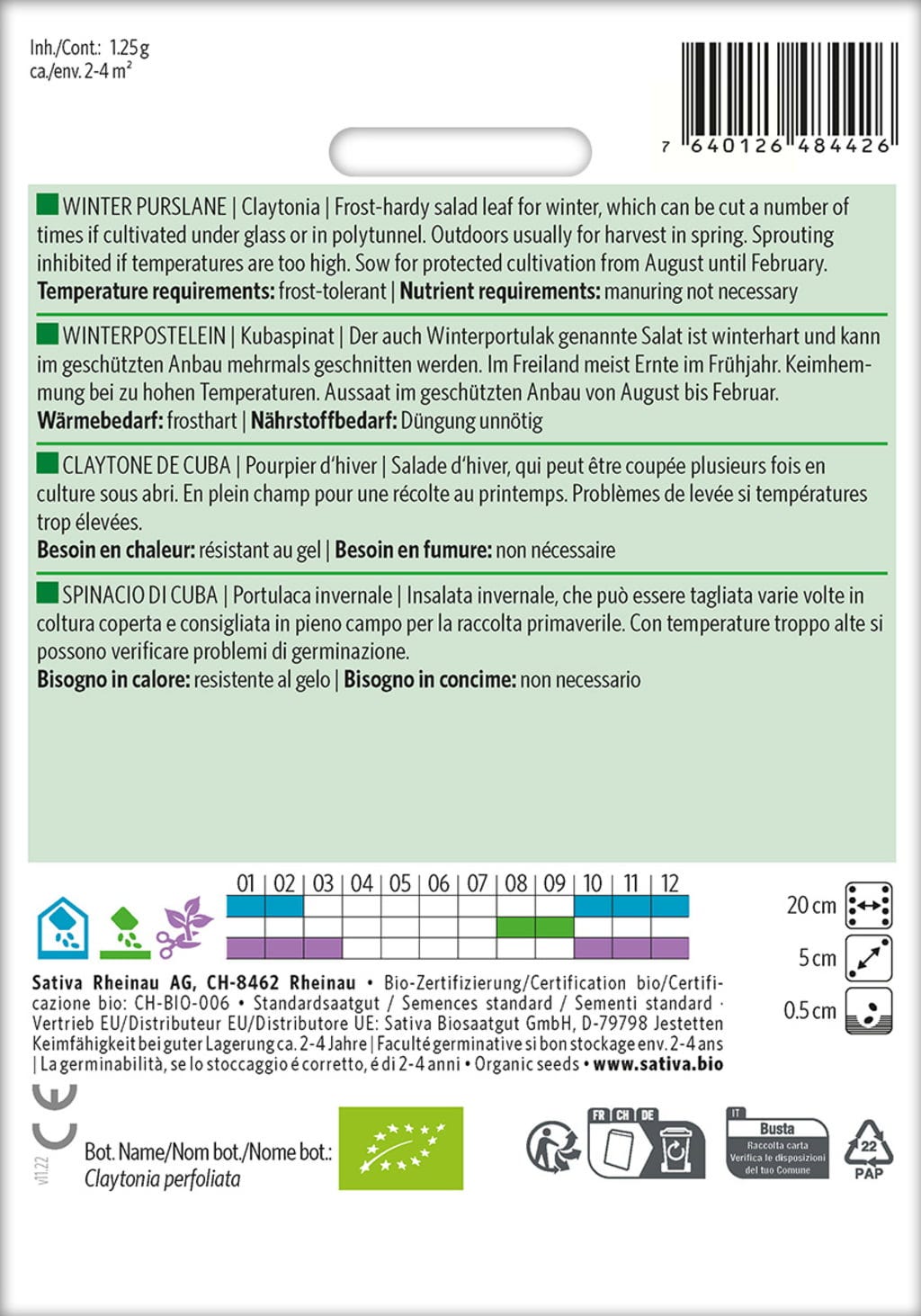 Winter purslane, also known as miner's lettuce or Cuban spinach, is winter hardy and can be harvested several times when grown under protection. If cultivated outdoors, harvesting usually takes place in spring. The variety does not germinate as well at temperatures that are too high. Protected cultivation is easily possible from August to February.