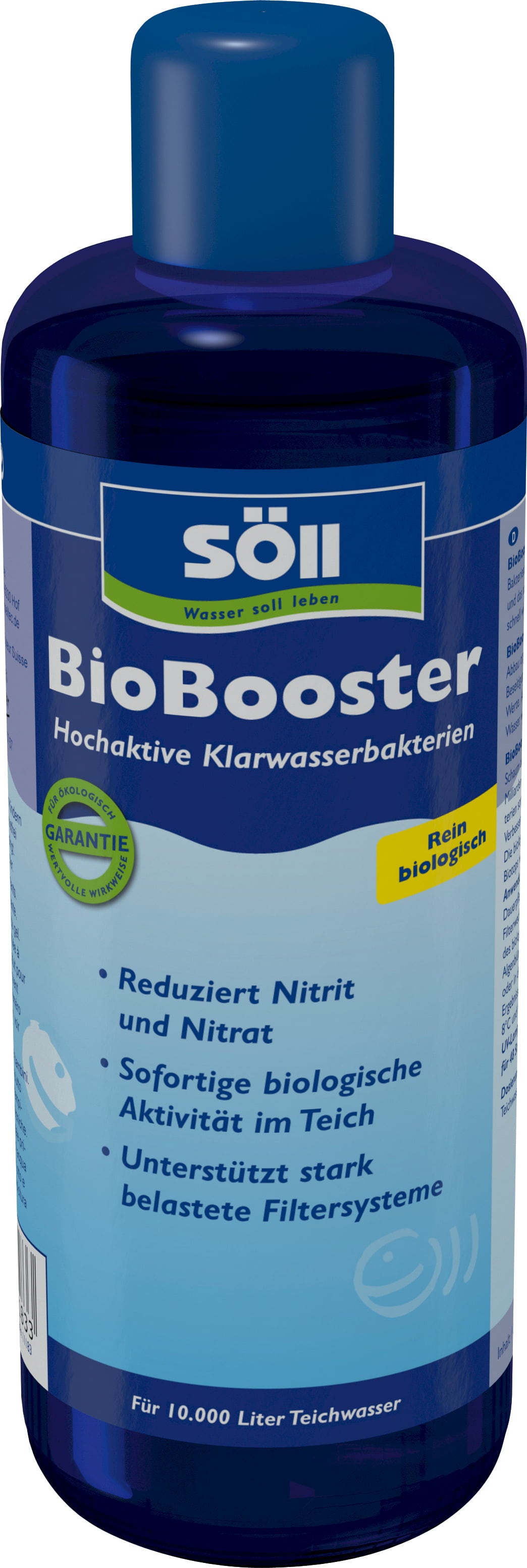 Der BioBooster von Söll ist ein Präparat, das mithilfe von hochswirksamen Bakterienkulturen die biologische Beschaffenheit des Teichwassers rapide stabilisiert. Er baut nicht nur organische Trübstoffe ab, sondern auch anorganische Verbindungen. Auch die Nitrit- und Nitratgehalte im Wasser werden durch ihn nachhaltig gesenkt. Das Produkt ist mit unzähligen Klarwasserbakterien angereichert. Diese verbessern die Wasserqualität spürbar und unterstützen die biologische Selbstreinigung des Teiches.