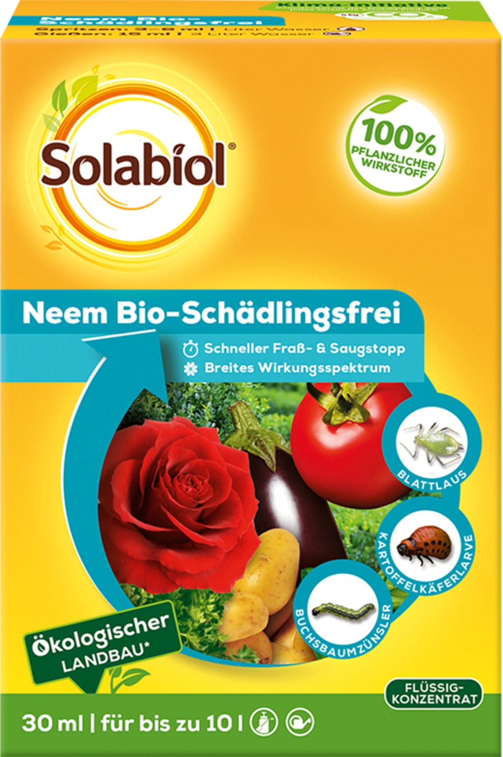 Solabiol Neem Bio Pest-Free protects plants against sucking and biting plant pests such as the box tree caterpillar, Colorado potato beetle and spider mites. It is suitable for use on ornamental plants, herbs, vegetables and potatoes.