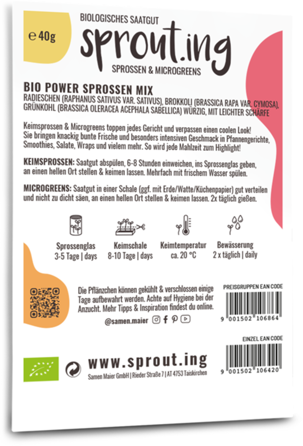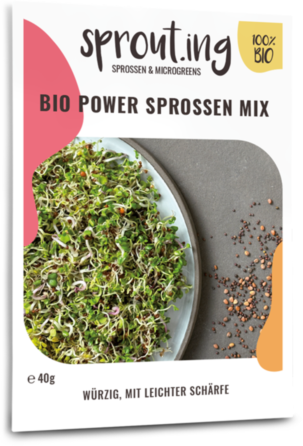 The Power Sprout Mix is a mixture of crunchy green, pink and purple-coloured sprouts: Strong, colourful, full of energy and flavour. With its powerful, intensely spicy, slightly hot and nutty flavours, it brings that certain something to the plate. It is also rich in vitamins, minerals, enzymes and vegetable proteins and adds power to both hot and cold dishes.